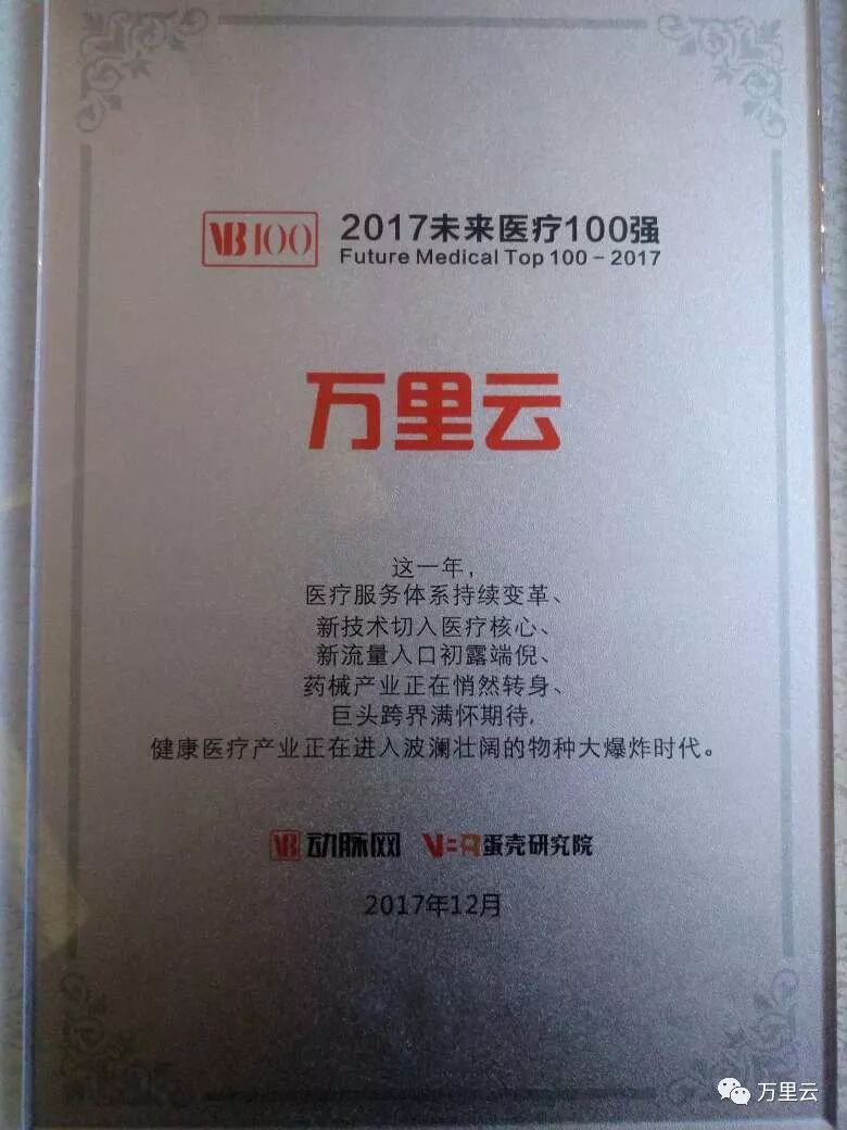 在15日发布的2017未来医疗100强榜上,经由多位产业专家、投资人、创业实践者组成的评委会评选,万里云成功入选未来医疗100强。未来医疗100强榜单综合各方信息核定公司估值,并将其作为唯一评判标准,筛选100家中国医疗健康领域的非上市企业,按照市场估值由高到低进行排序。